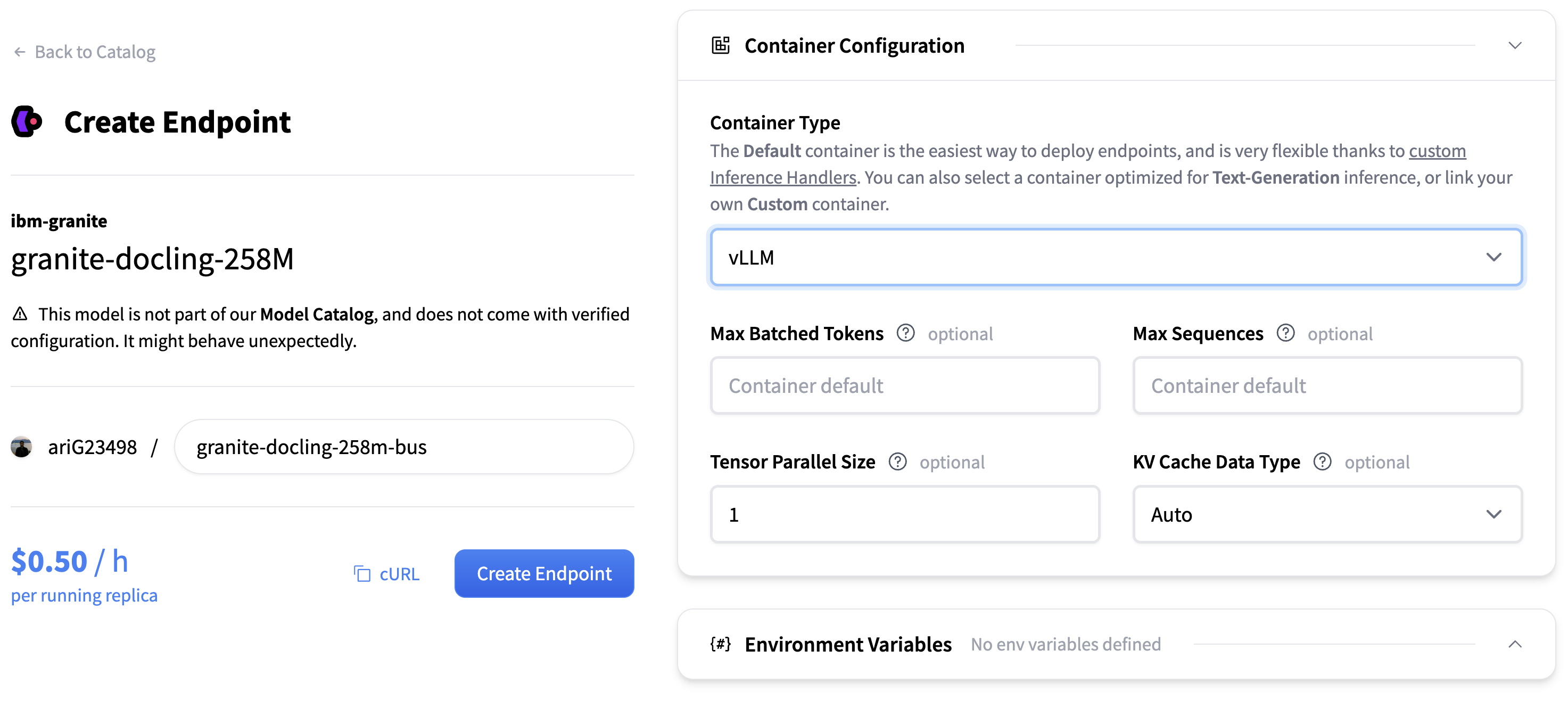 DEPLOYMENT_URLwith the URL provided in the console (remember to add/v1needed). You can then use your endpoint programmatically or via the SDK.# pip install openai from openai import OpenAI import os client = OpenAI( base_url = DEPLOYMENT_URL, api_key = os.environ["HF_TOKEN"] # https://huggingface.co/settings/tokens ) chat_completion = client.chat.completions.create( model = "ibm-granite/granite-docling-258M", messages = [ { "role": "user", "content": [ { "type": "image_url", "image_url": { "url": "https://huggingface.co/ibm-granite/granite-docling-258M/resolve/main/assets/new_arxiv.png" } }, { "type": "text", "text": "Convert this page to docling." } ] } ], stream = True ) for message in chat_completion: print(message.choices[0].delta.content, end = "")