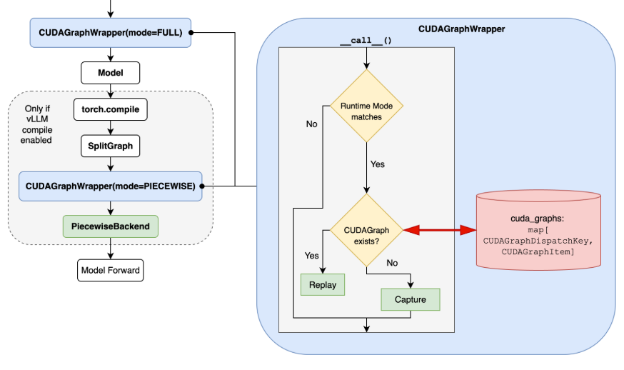 The above steps are based on the assumption that the CUDA Graphs wrapper would directly trust what’s in the forward context (controlled by the dispatcher). This lets us simplify and cenralize the logic, reducing the complexity as well as the risk of mismatched state between the wrappers and the dispatcher. It also allows reusing the wrapper class for both FULL and PIECEWISE runtime modes. See the implementation here.